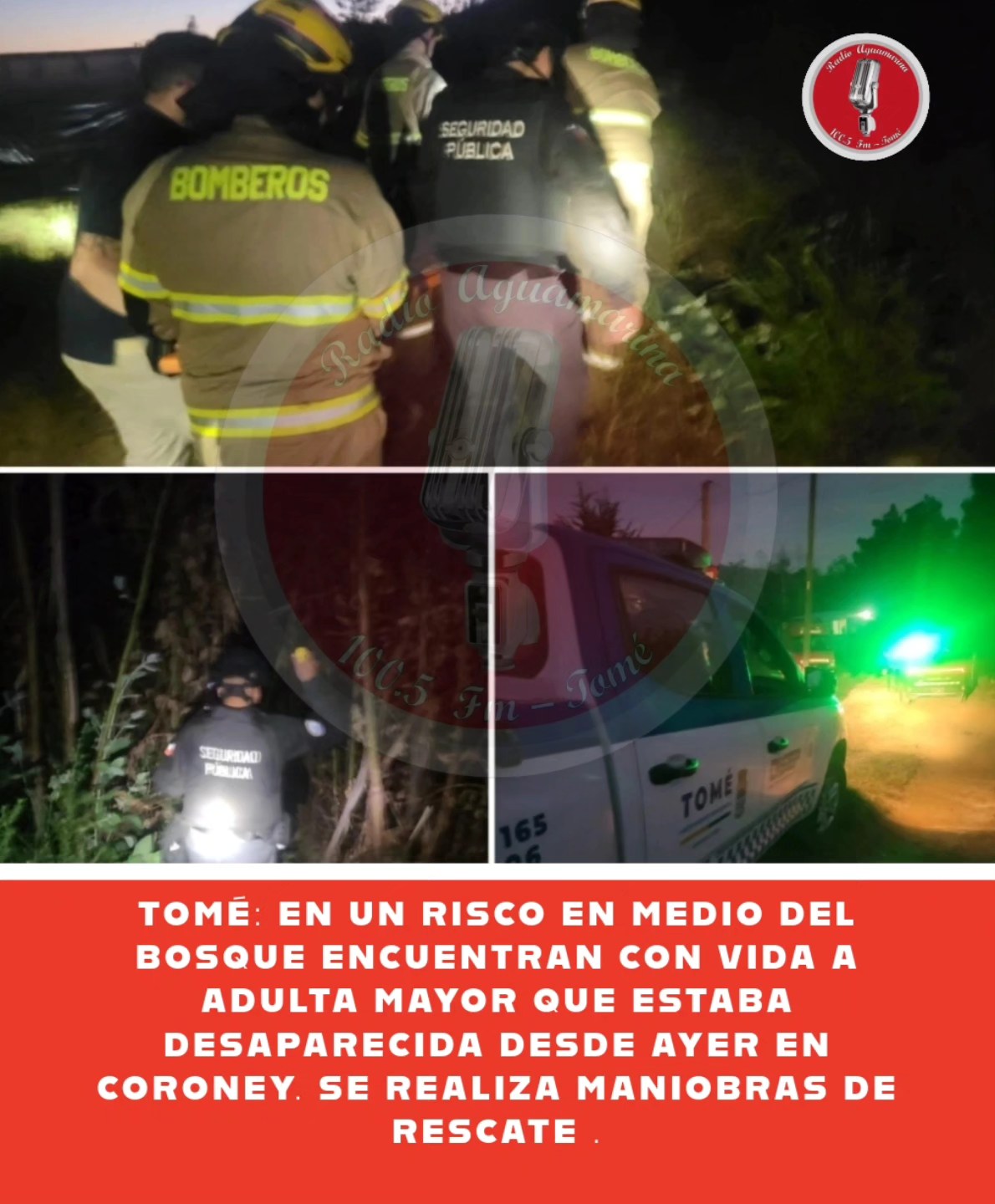 TOMÉ: EN UN RISCO EN MEDIO DEL BOSQUE ENCUENTRAN CON VIDA A ADULTA MAYOR QUE ESTABA DESAPARECIDA DESDE AYER EN CORONEY. SE REALIZA MANIOBRAS DE RESCATE .