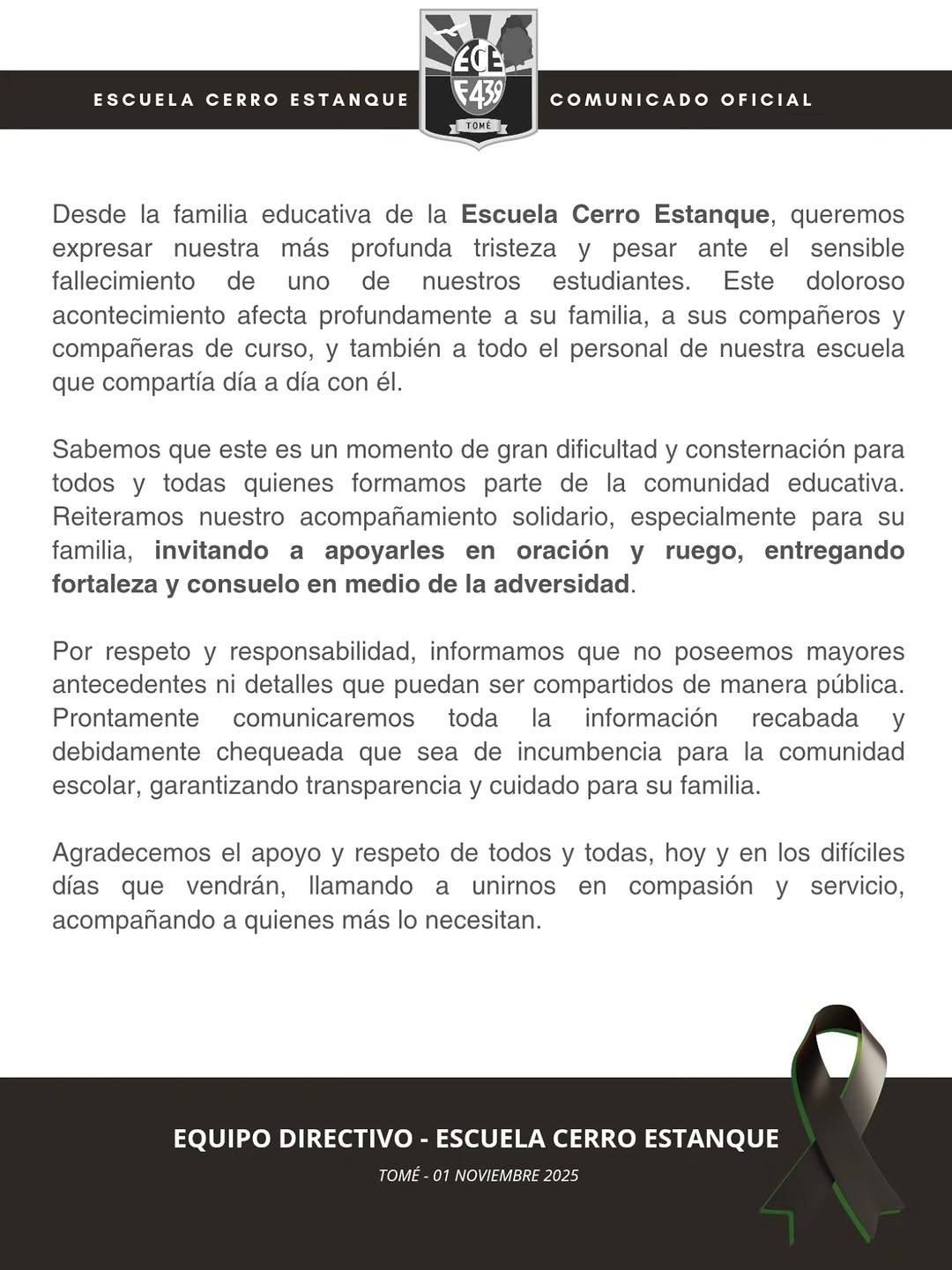Mediante sus RRSS, escuela de cerro Estanque escribieron : " Extraño día lunes el de hoy. Nuestro acostumbrado acto cívico de inicio de semana, se transformó en momento de reflexión y minuto de silencio [...]