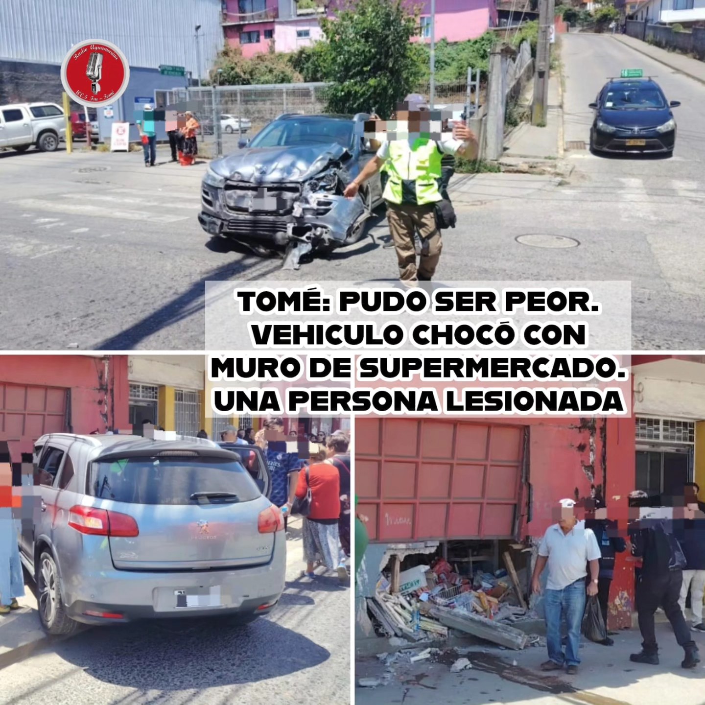 TOMÉ: PUDO SER PEOR. VEHÍCULO CHOCÓ CON MURO DE SUPERMERCADO. UNA PERSONA LESIONADA.