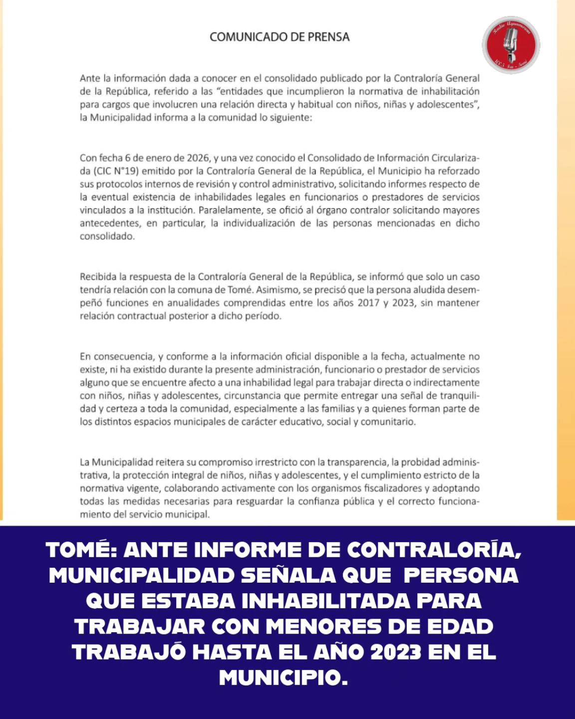 Mediante un comunicado, el municipio señala: » Ante la información dada a conocer en el consolidado publicado por la Contraloría General de la República, referido a las “entidades que incumplieron la normativa de inhabilitación para cargos que involucren una relación directa y habitual con niños, niñas y adolescentes”, la Municipalidad informa a la comunidad lo siguiente: