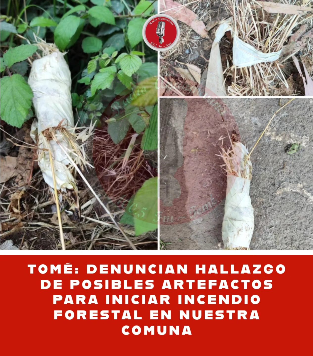 El día de ayer alrededor de las 20:20 horas esperaba locomoción en sector alto de Coliumo con dirección a Tomé, en un paradero frente a la casa de mis padres, al mirar hacia abajo note que había un rollo de pasto seco envuelto el cinta adhesiva con papel en el centro y a medio quemar, me causó mucha preocupación, ya que por el borde del camino hay mucho pasto seco y algo de matorral de fácil encendido, mire más y había otro, igual un poco quemado.